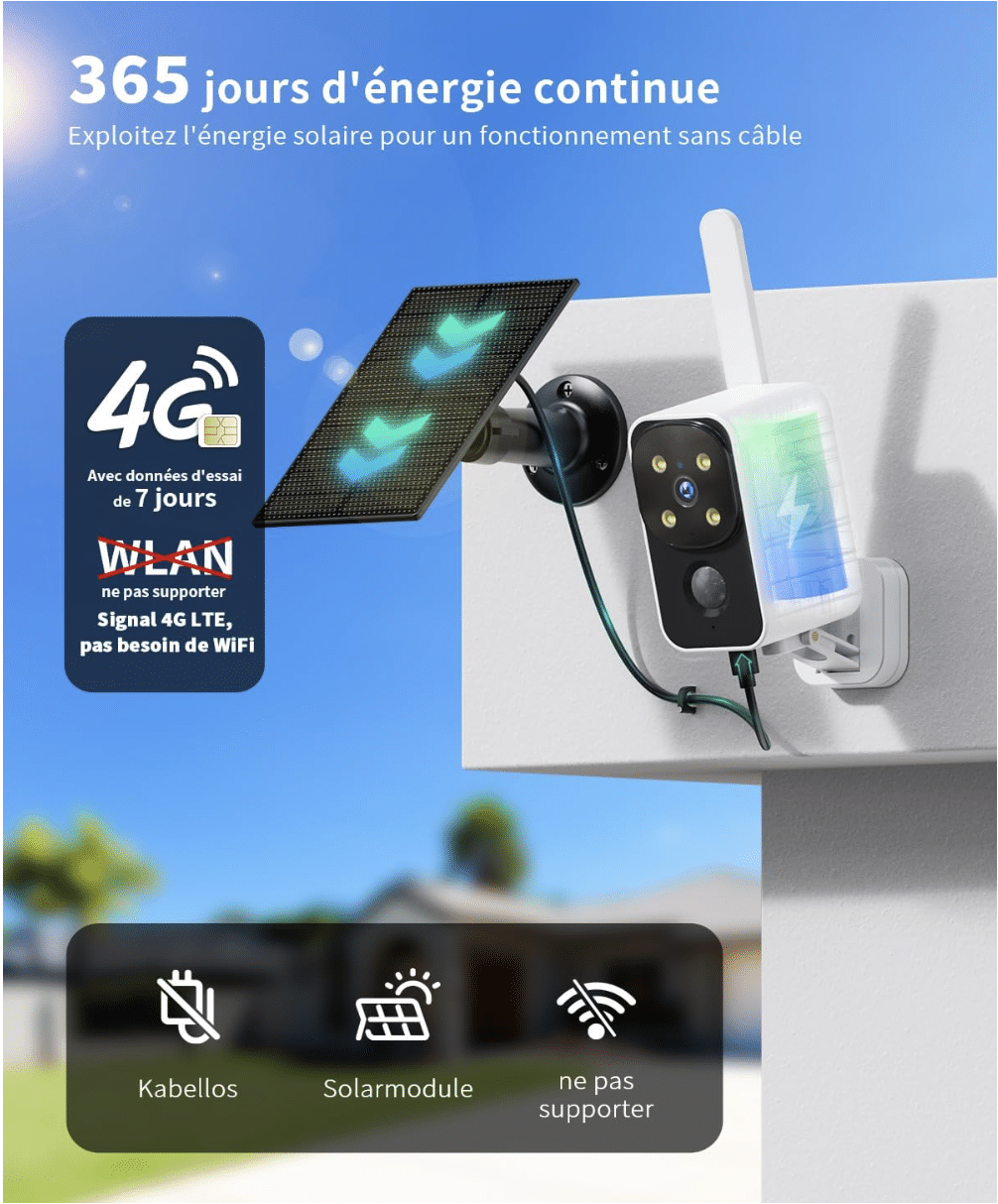 Idéale pour zones sans réseau filaire : cette caméra fonctionne via 4G LTE/GSM (carte SIM fournie en essai illimité 7 jours), puis abonnement data 4G. Pas de Wi-Fi requis/supporté. Rotation horizontale 180° via l’application pour couvrir l’ensemble de votre terrain (maison, jardin, chantier). L’alimentation est assurée par une batterie 9000 mAh et un panneau solaire 3 W pour une autonomie 365 jours.