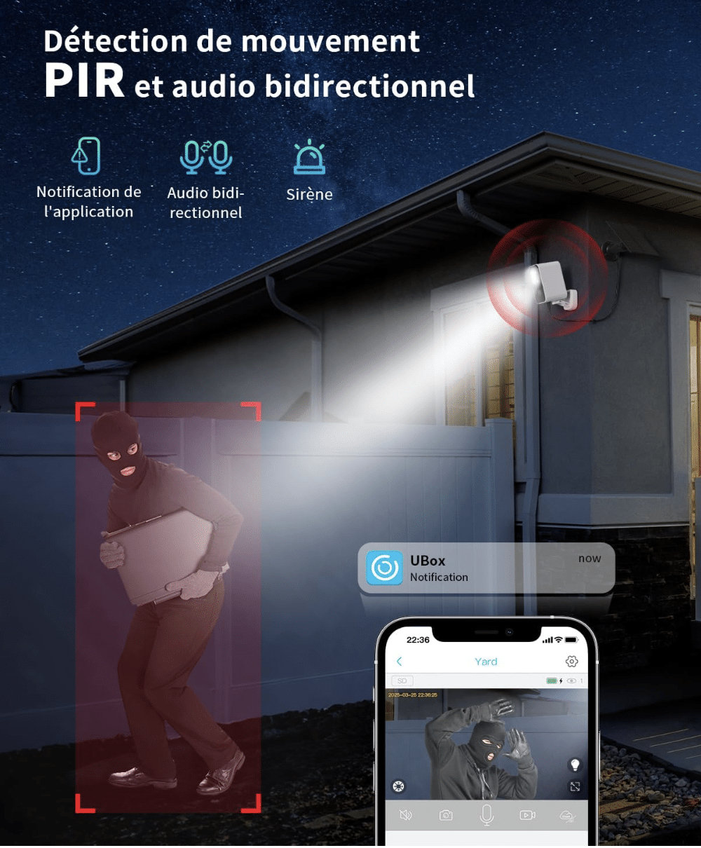 Qualité 2K 3MP (2304×1296), projecteur intégré et 4 LED pour une vision nocturne couleur réaliste. Détection IA de personnes + PIR : réduction des fausses alertes, notifications push instantanées. Triple dissuasion : alarme vocale personnalisable, lumière stroboscopique, audio 2-voies pour dialoguer avec les visiteurs.