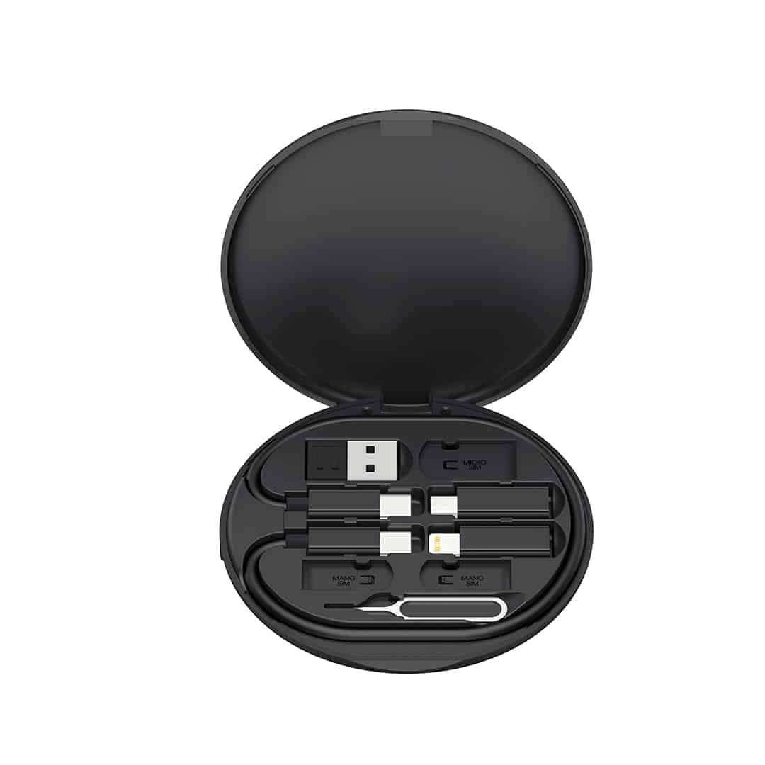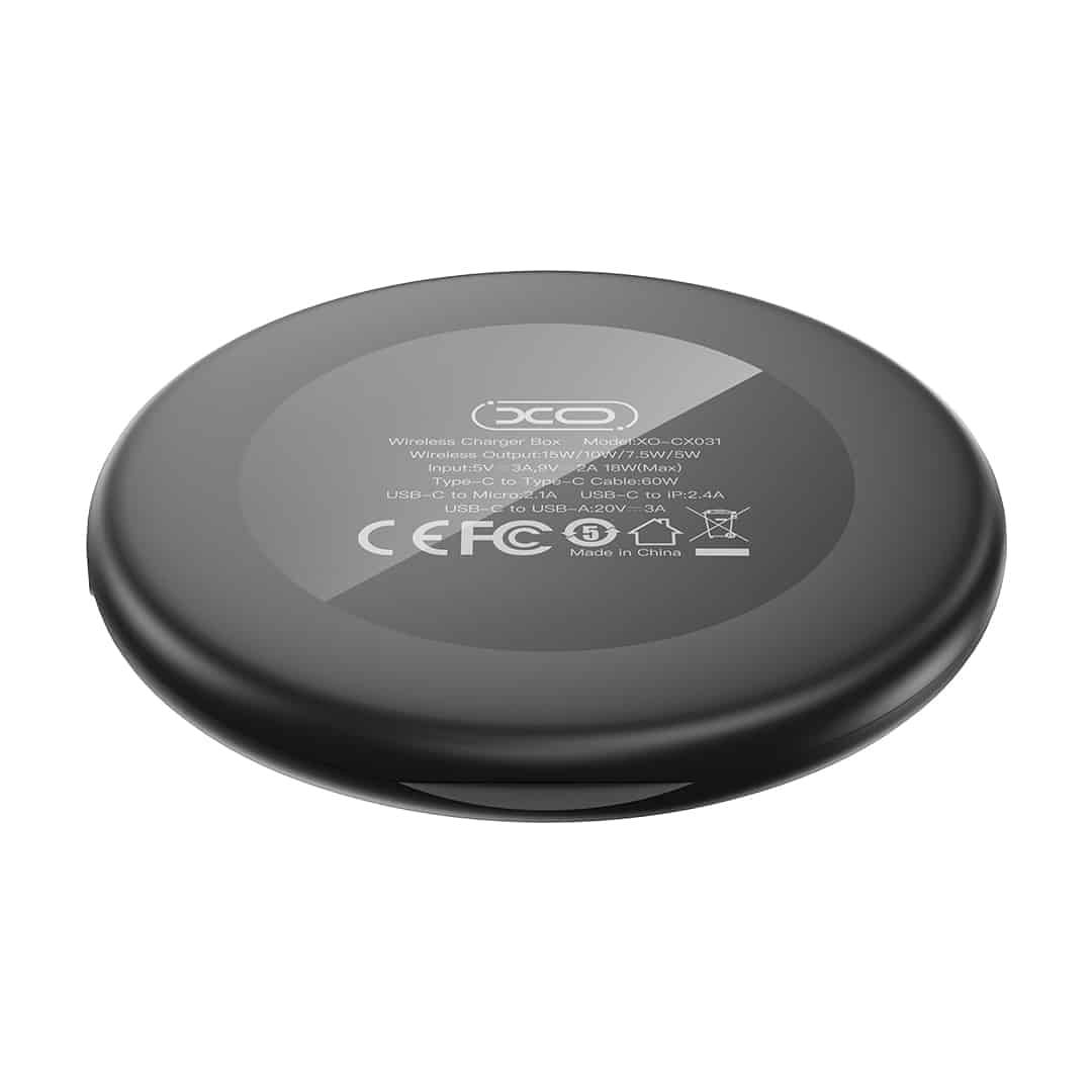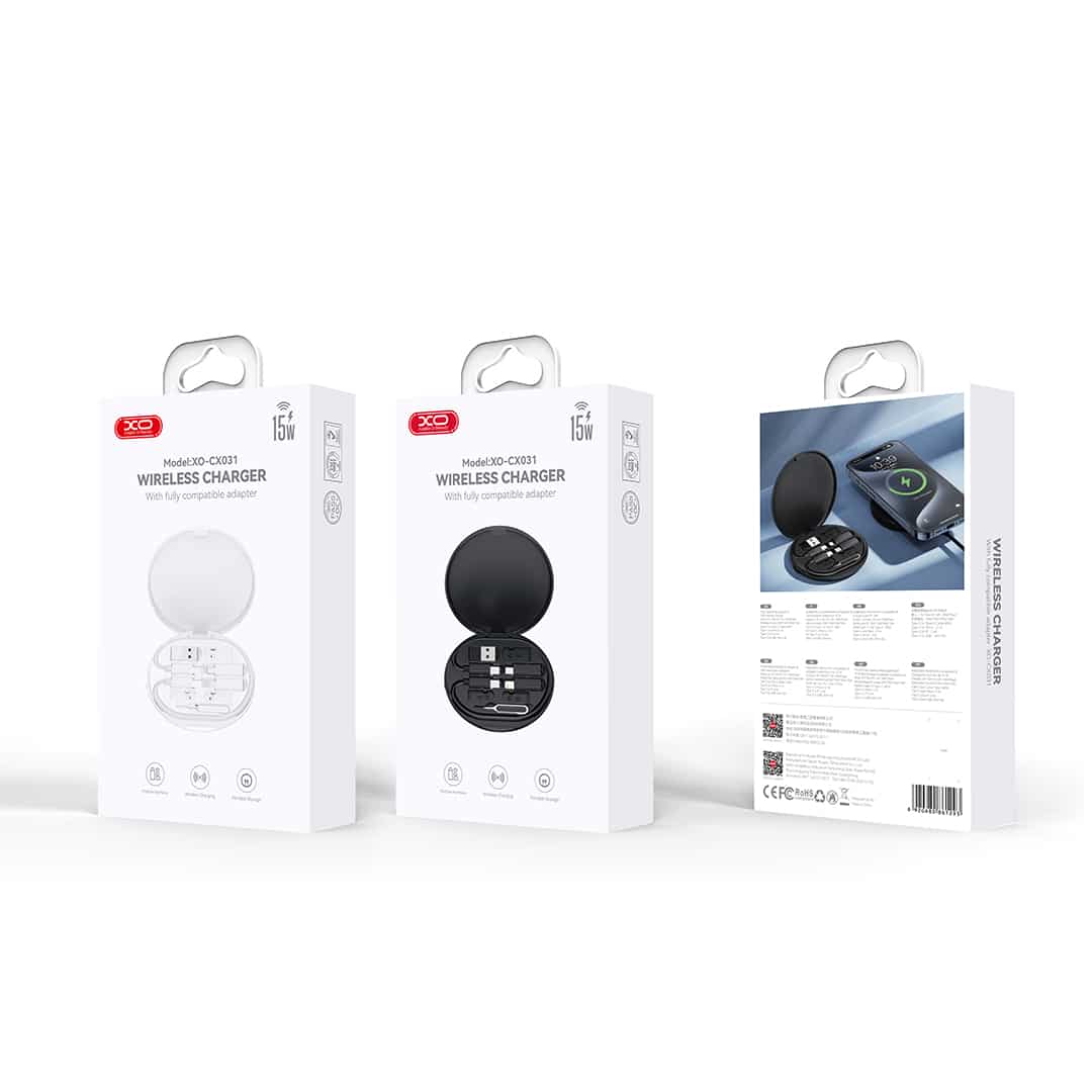 Chargeur XO CX031 15 W noir, technologie Qi, charge rapide sans fil, avec câbles et adaptateurs USB-C, microUSB, Lightning inclus.